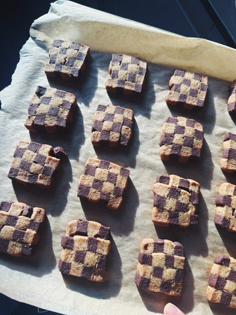through January, you can enjoy our brown butter chai checkerboard biscuits. this is a classic ashram (ginger) masala chai brewed in butter and worked into two types of dough - one that is further enriched with fair-trade and organic cocoa.